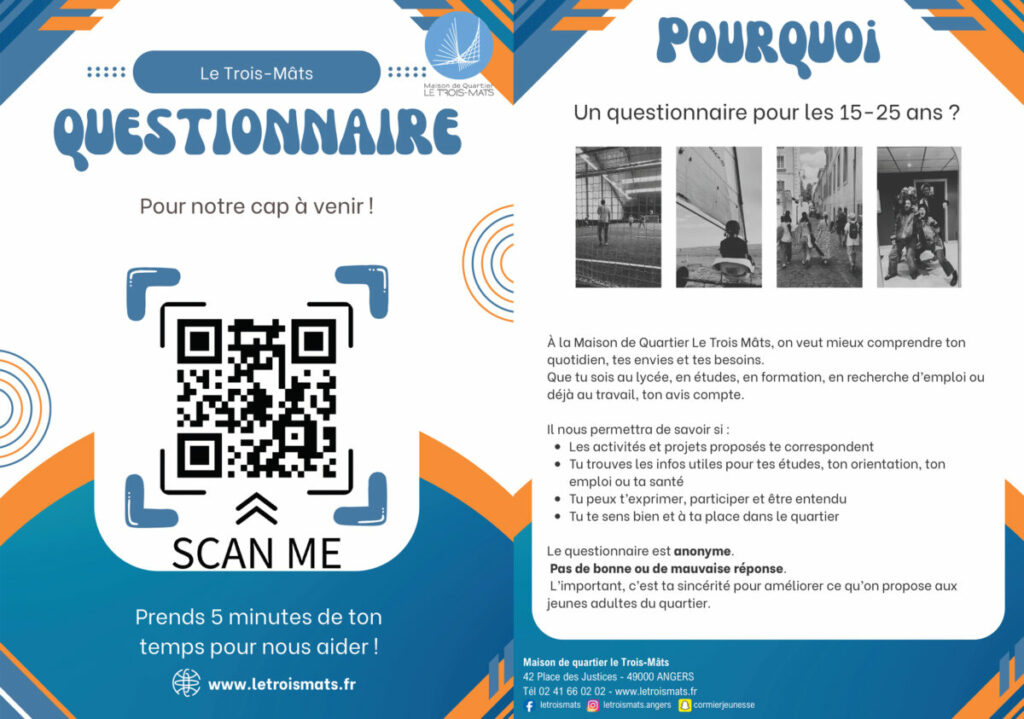 Merci de prendre quelques minutes pour répondre. Cette mini enquête s’adresse aux jeunes âgés de 15 à 25 ans. C’est pour nous le temps de faire le point sur nos actions en identifiant des perspectives nouvelles! Nous souhaitons avoir vos regards sur le Trois Mâts, et surtout ce que vous aimeriez faire avec nous!